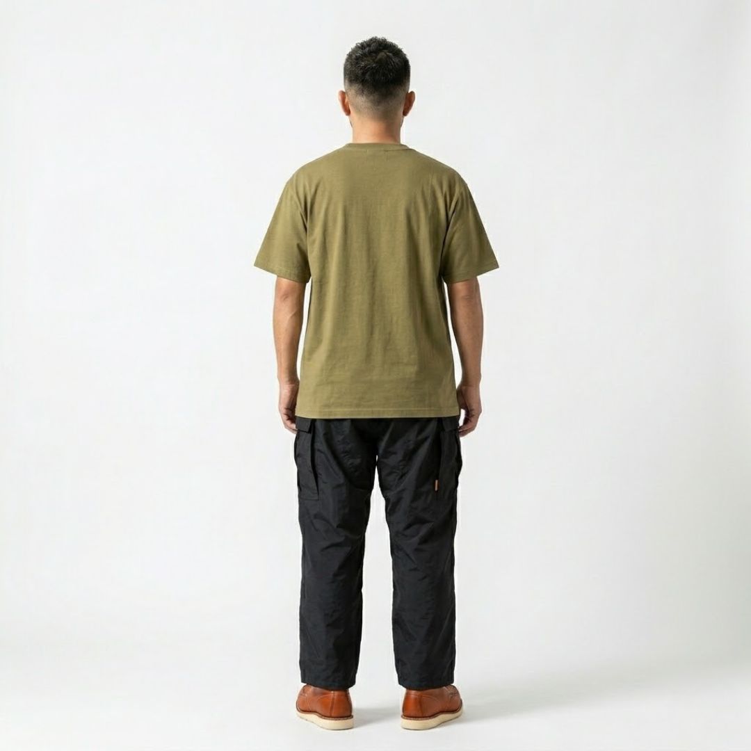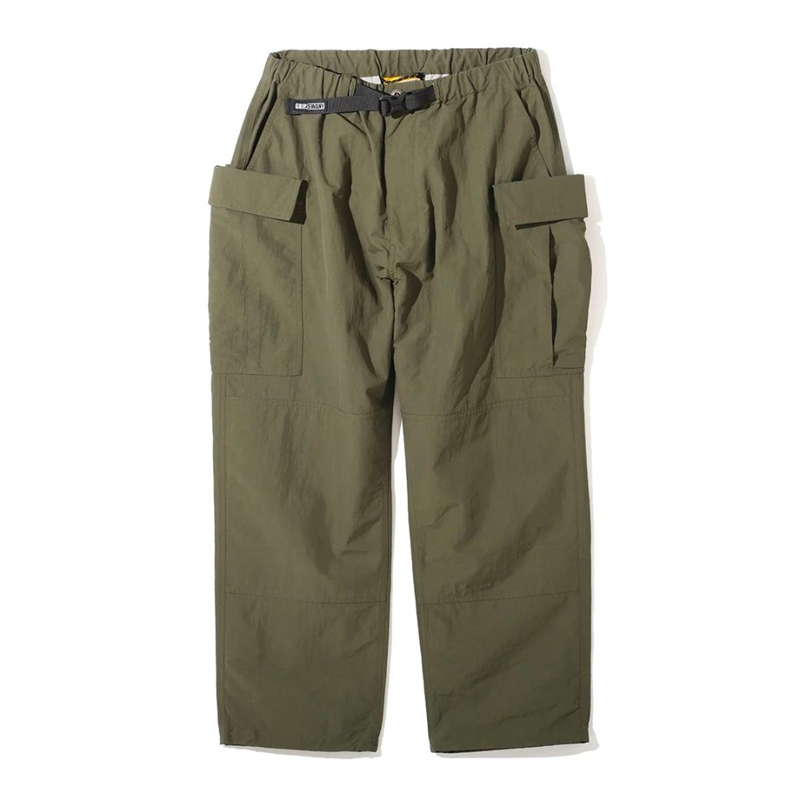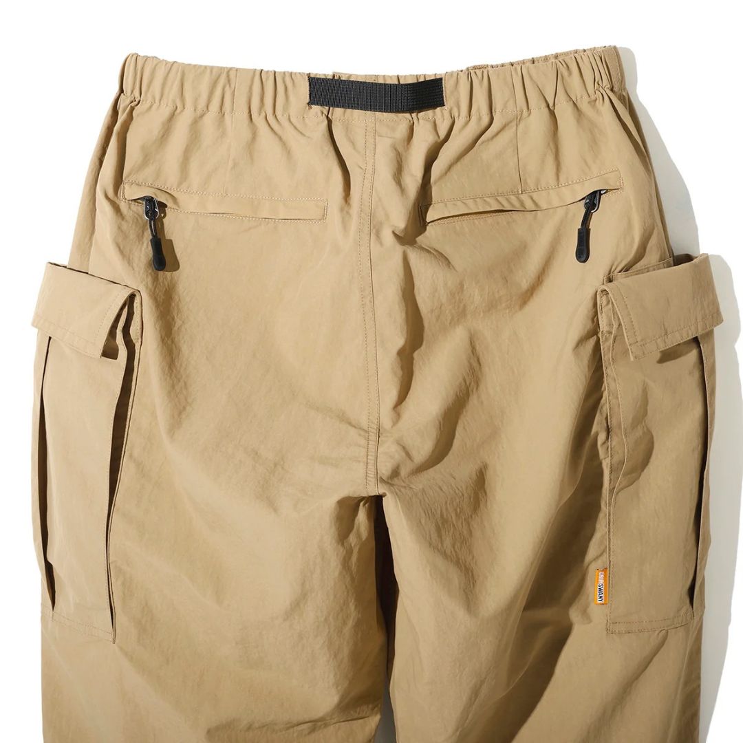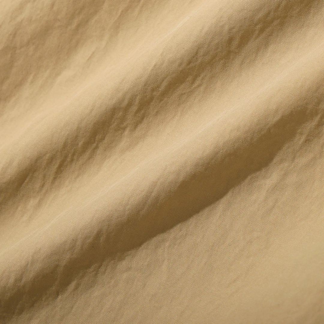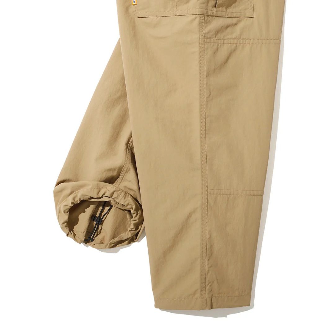 素材には、撥水加工を施した柔らかな風合いのタスランナイロンを使用。コットンライクなマットな質感ながら、ナイロン特有の軽さと耐久性を兼ね備えています。シルエットは全体的にゆとりを持たせつつ、裾にかけてテーパードを効かせることで、足元のもたつきを抑えたすっきりとした印象に仕上げました。