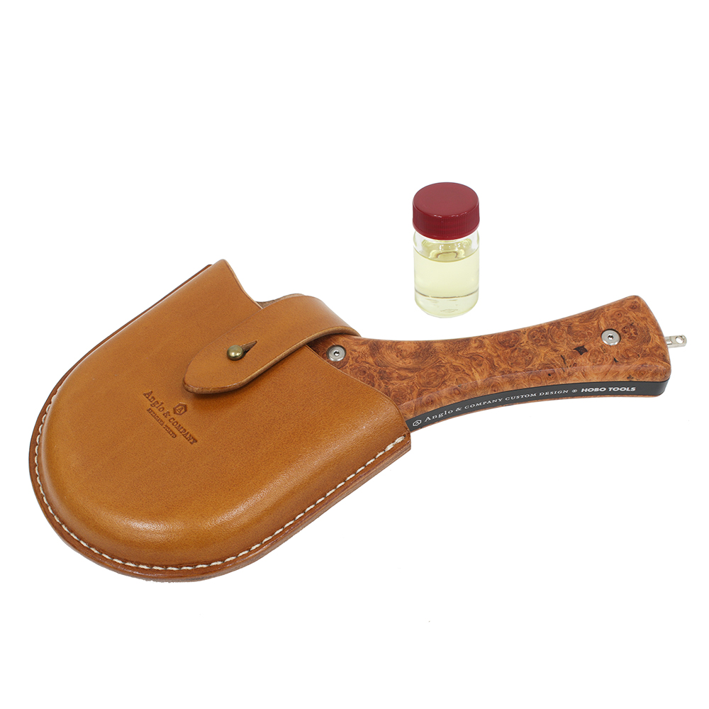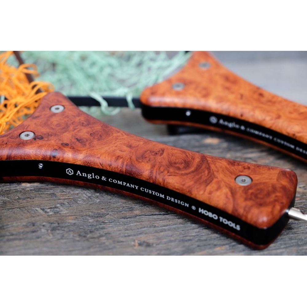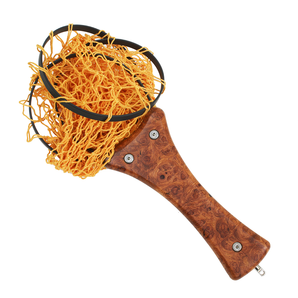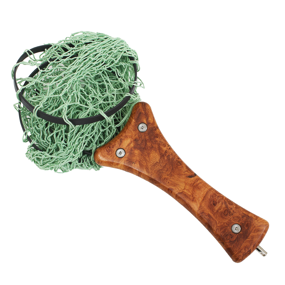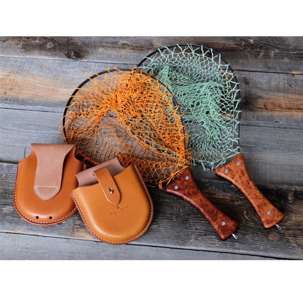 渓流域での使用に最適なサイズのフォールディングネット ハンドルフレームは高度なマシンカットによる一体型アルミフレーム、 ウッド部はカリンバールを樹脂インプリ後オイルフィニッシュ。 シースは上質な国産オイルドレザーをハンドステッチ仕上げ。 手編みネットはオレンジ、グリーンの2色