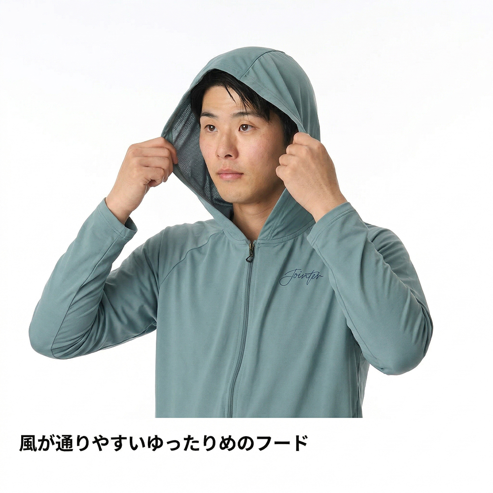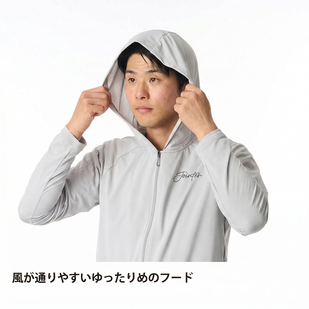 ●やや長めの袖丈/フードで頭部・首元まで日射しを遮る
