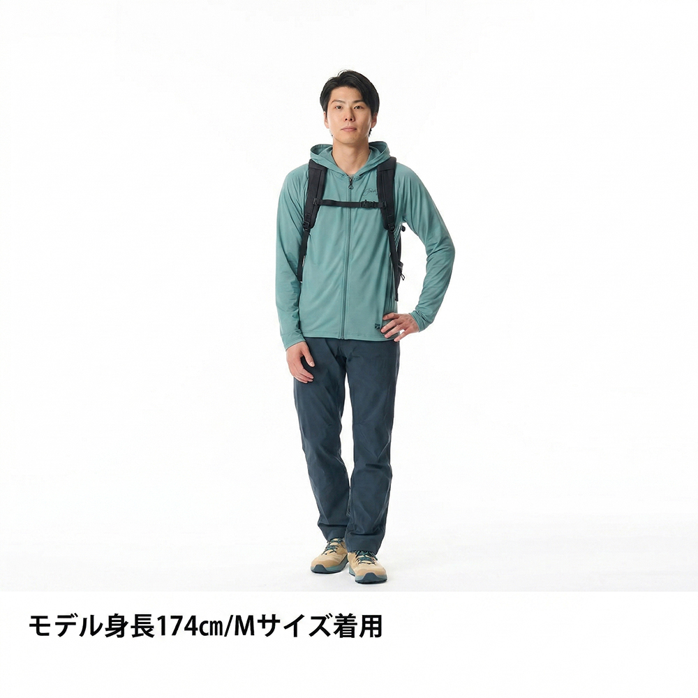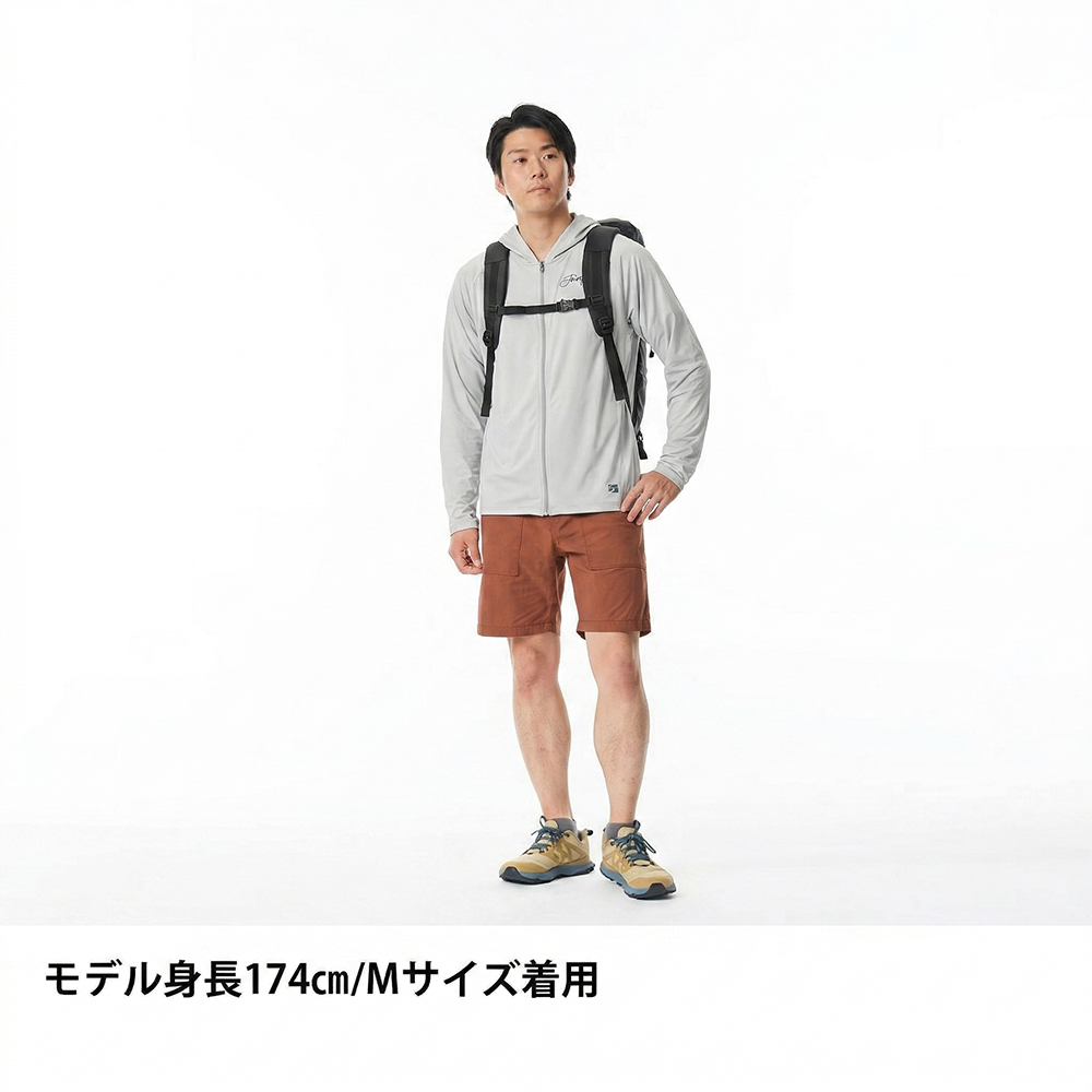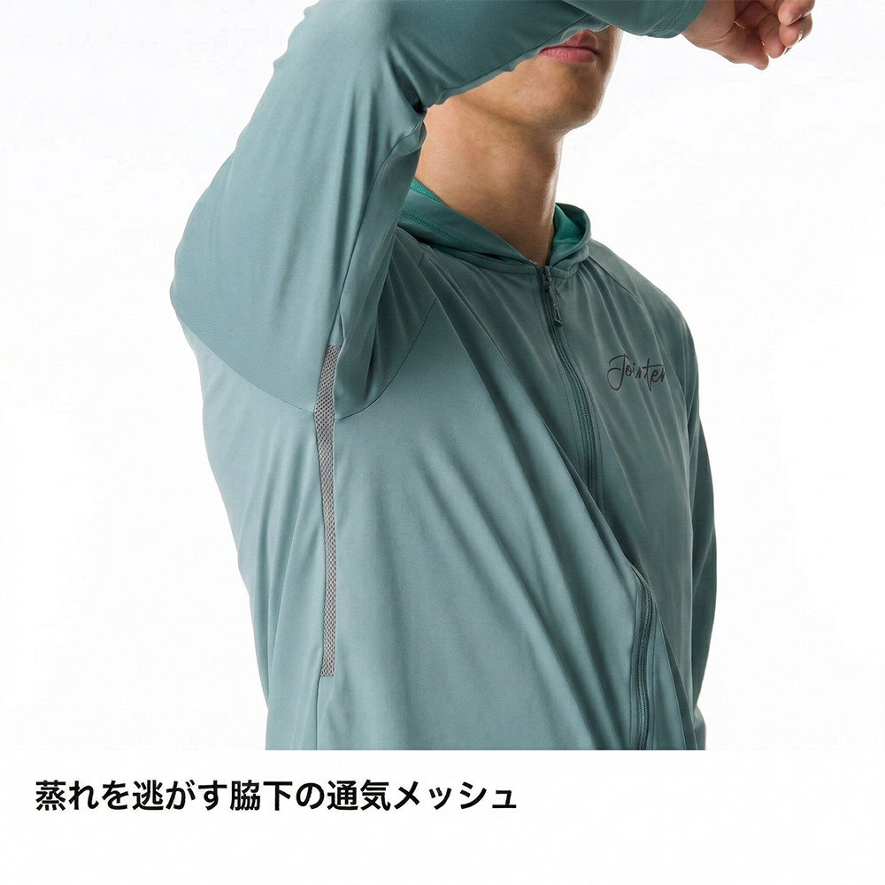 太陽熱の影響を抑える遮熱と、汗を素早く乾かす吸汗速乾を、生地設計で両立させたフーデッドベースレイヤー。
