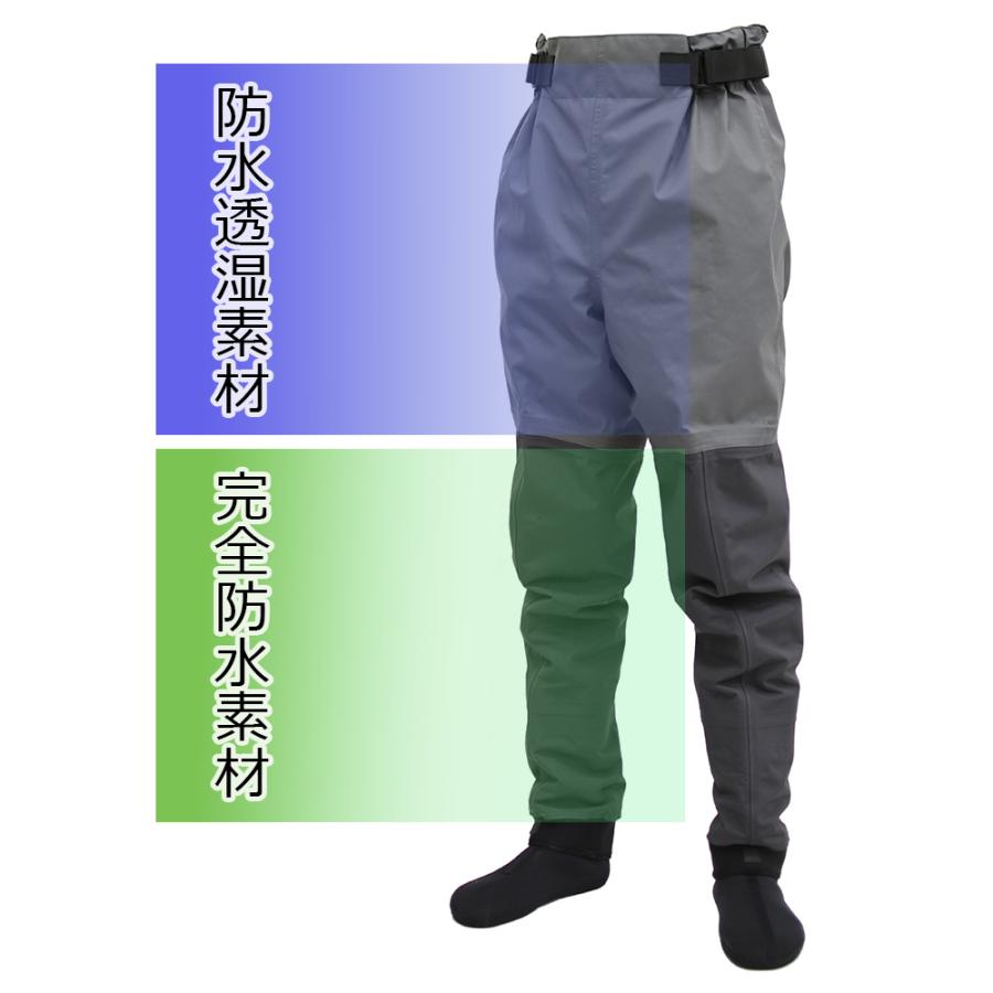 膝より下は、丈夫なナイロンにPVC加工を施した完全防水素材をハイブリッドに組み合わせた、全く新しいコンセプトのウェーダーです。