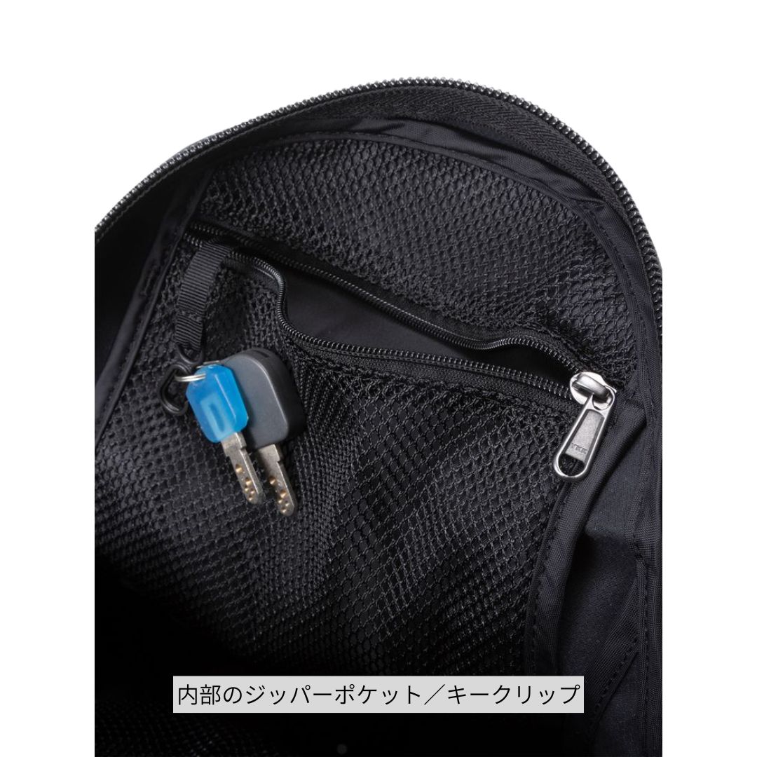・内部にジッパーポケット、キークリップ、メッシュ素材の背面スリーブを装備
